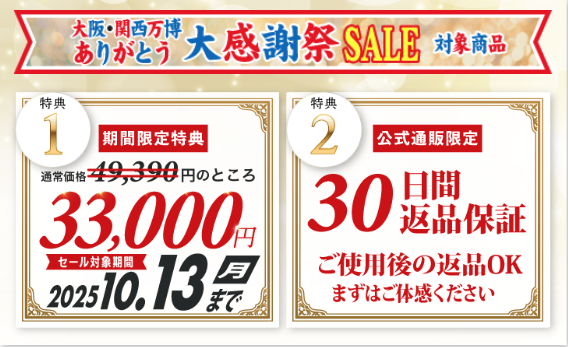 2025年10月(執筆日時点)、ミラブルゼロが33,000円で買える超特価キャンペーンが実施されています。