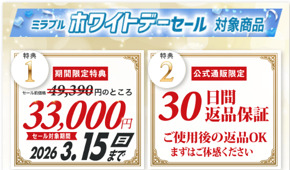 通常49,390円のミラブルゼロが、今なら33,000円で買えます。